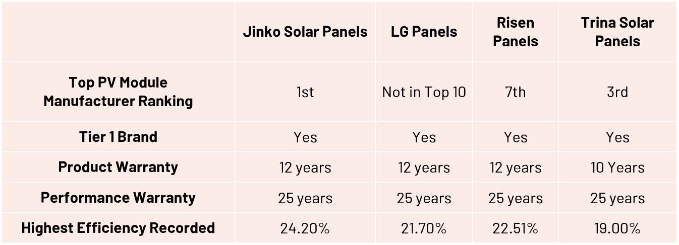 Điện năng lượng mặt trời Nam Việt Hưng (Nam Viet Hung Solar) đã và đang sử dụng tấm pin năng lượng mặt trời của Jinko, một trong những nhà cung cấp pin năng lượng mặt trời hàng đầu thế giới (theo Bloomberg New Energy Finance PV Module Tiering System Report).